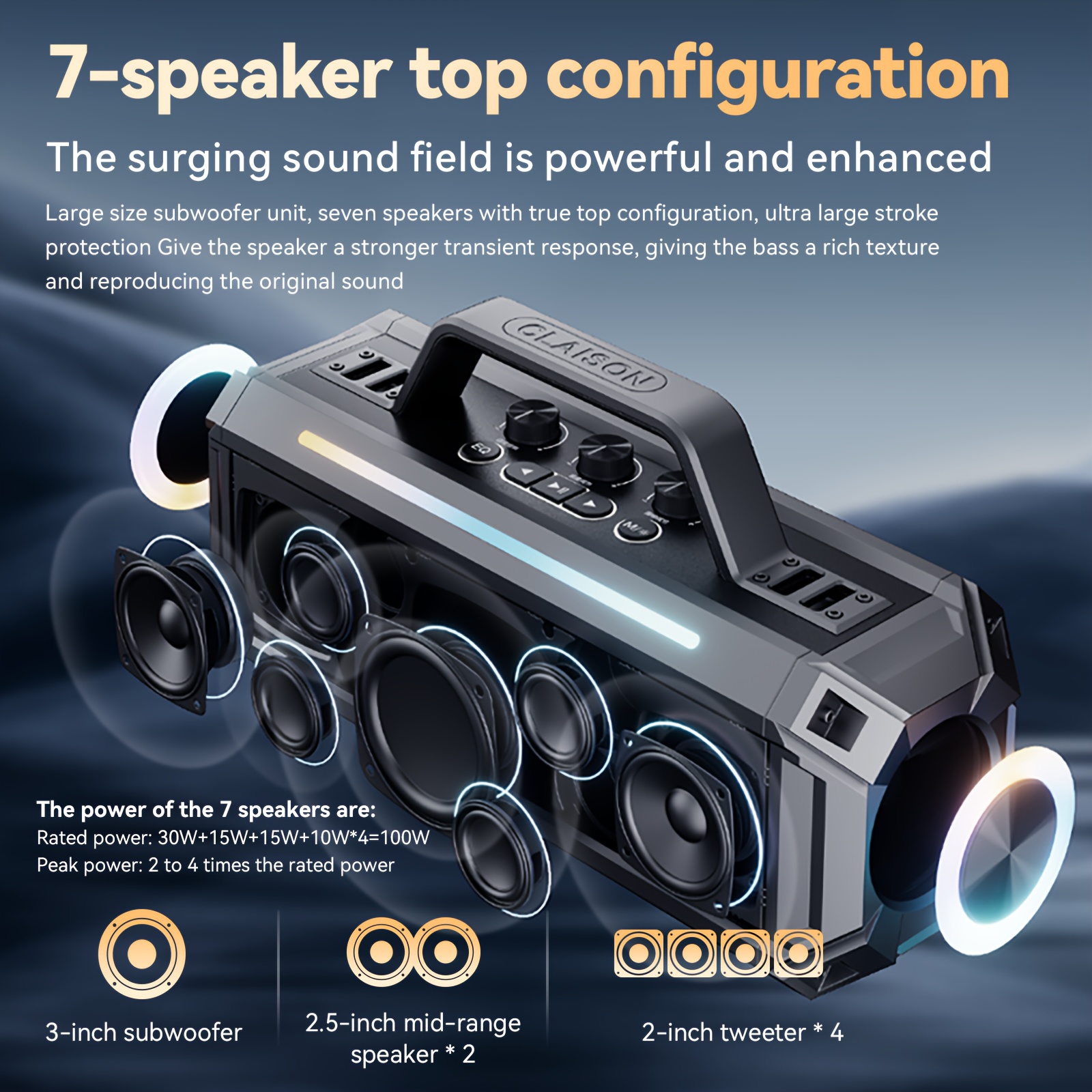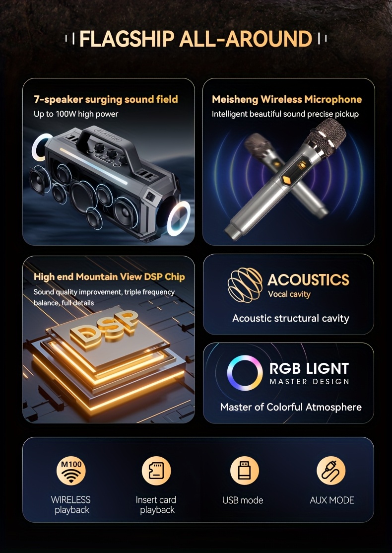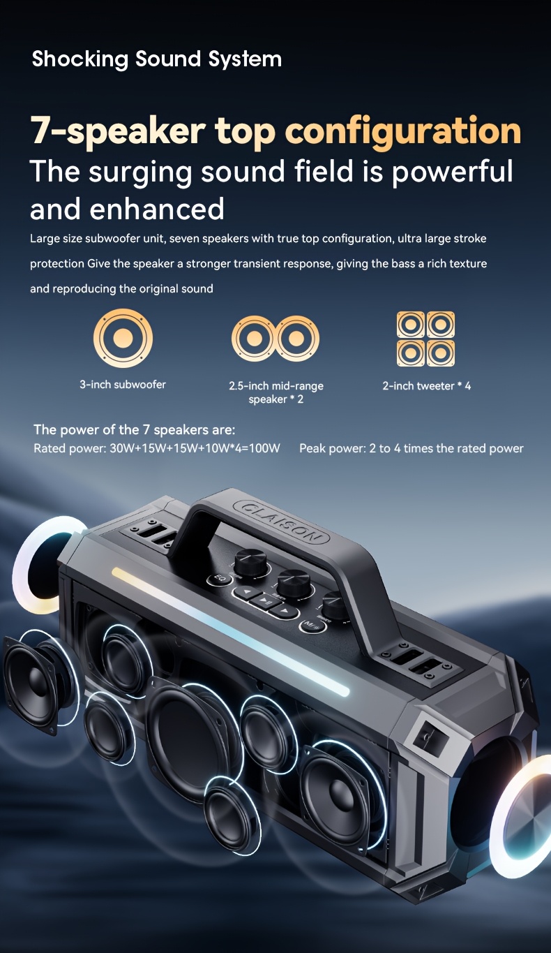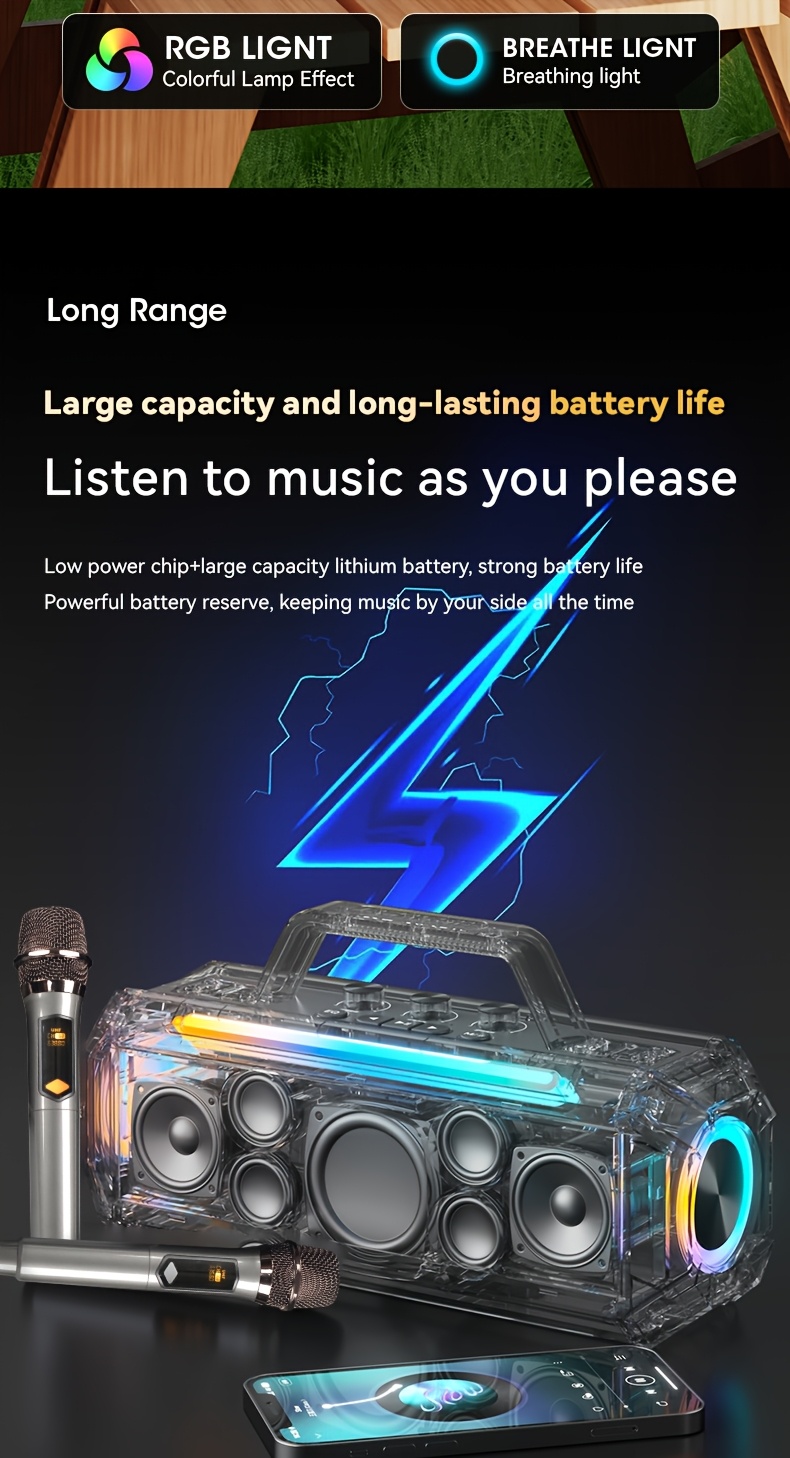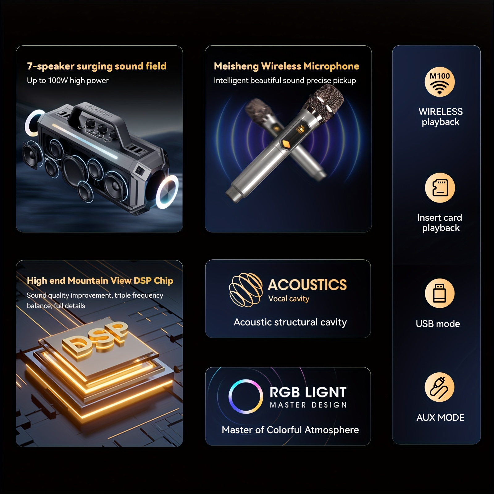 7-speaker Subwoofer, Dual Wireless Mic, 12 Hours RGB Atmosphere Light, Outdoor, FX EQ, U Disk, TF Card, AUX, Beautiful Voice, One-key Mute