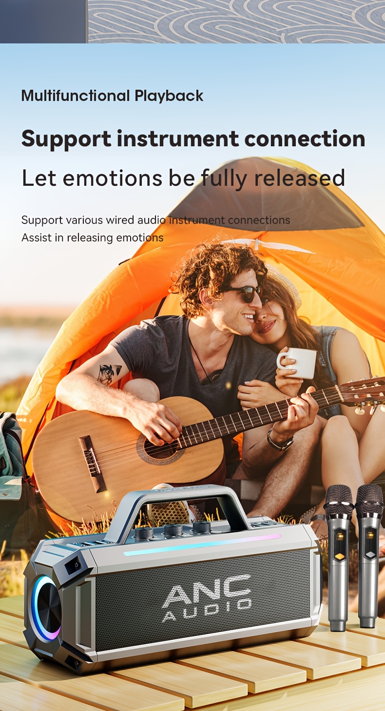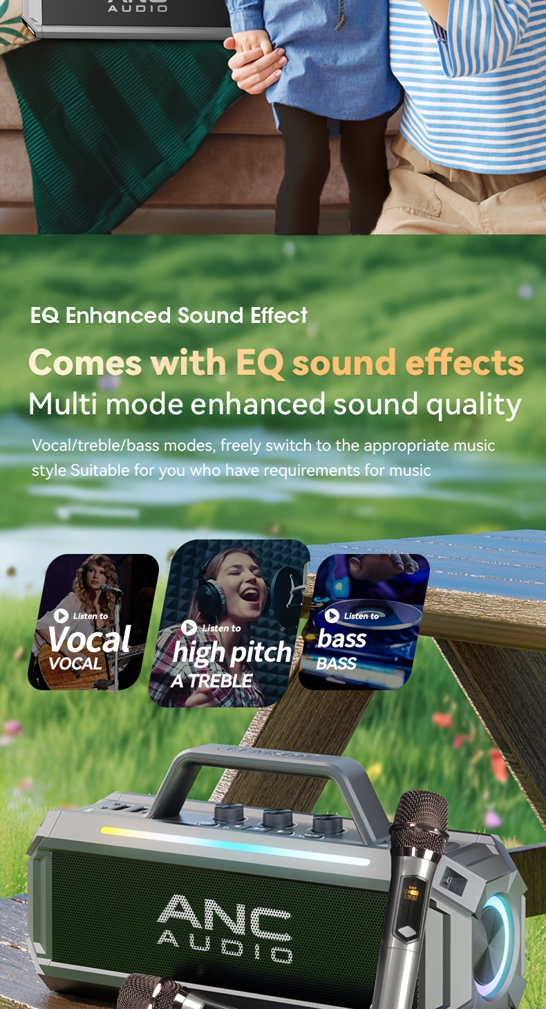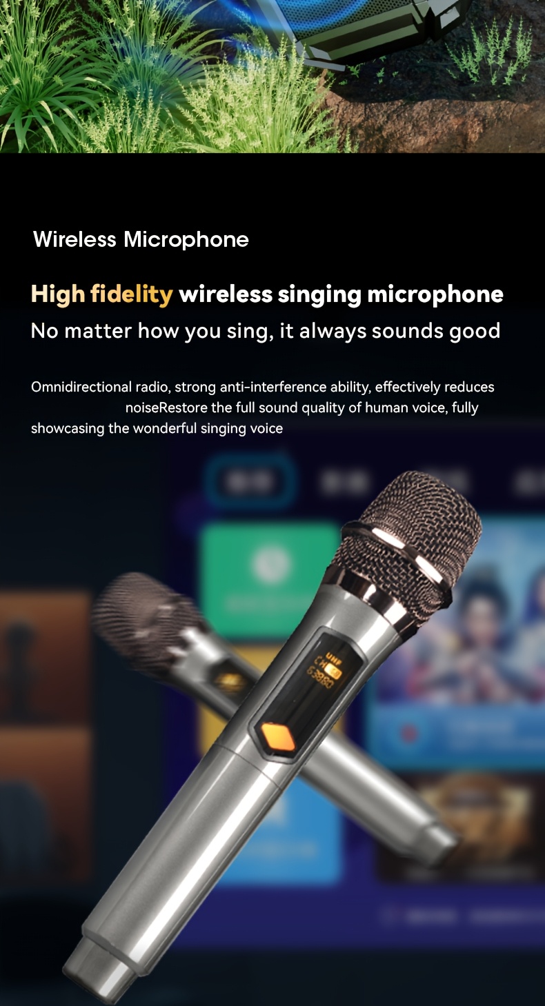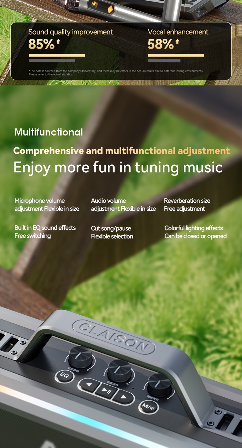 7-speaker Subwoofer, Dual Wireless Mic, 12 Hours RGB Atmosphere Light, Outdoor, FX EQ, U Disk, TF Card, AUX, Beautiful Voice, One-key Mute