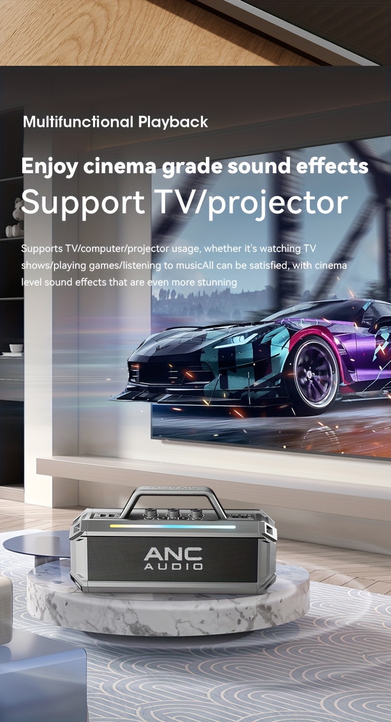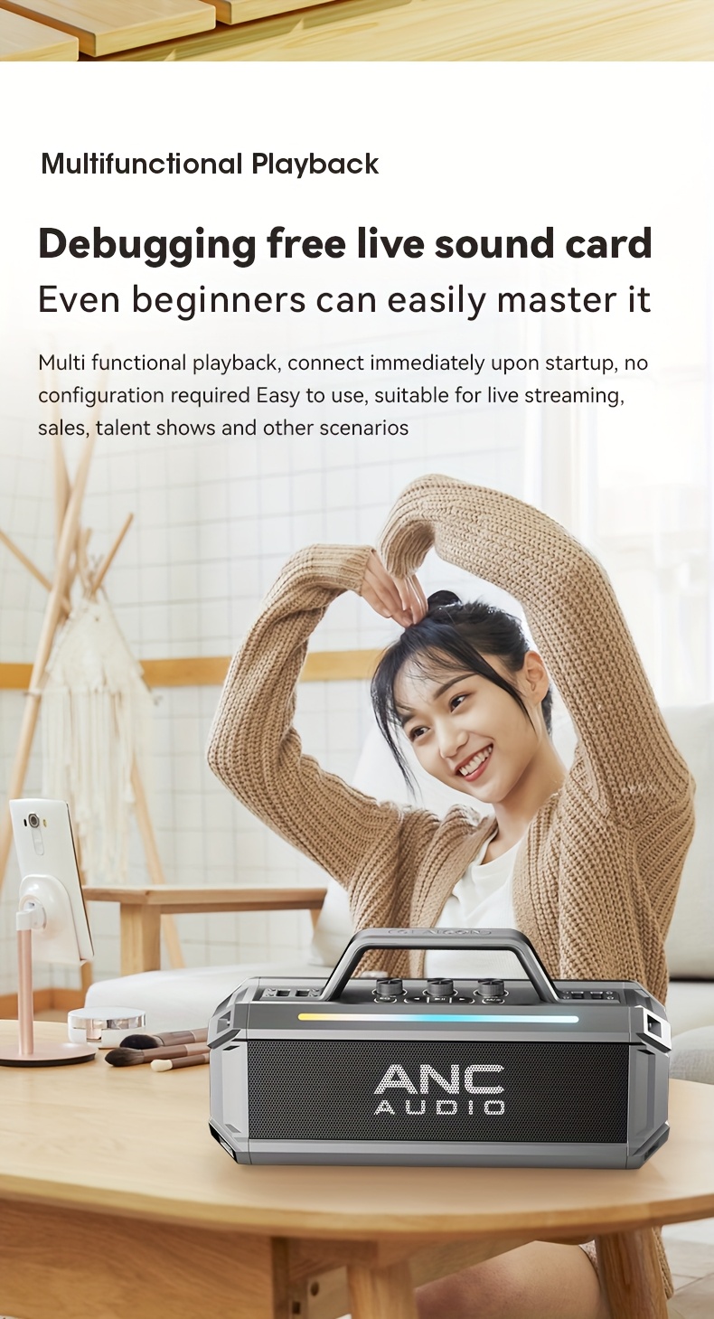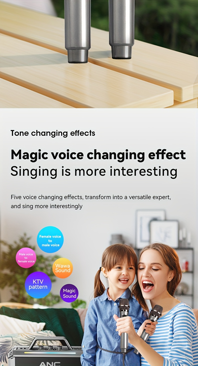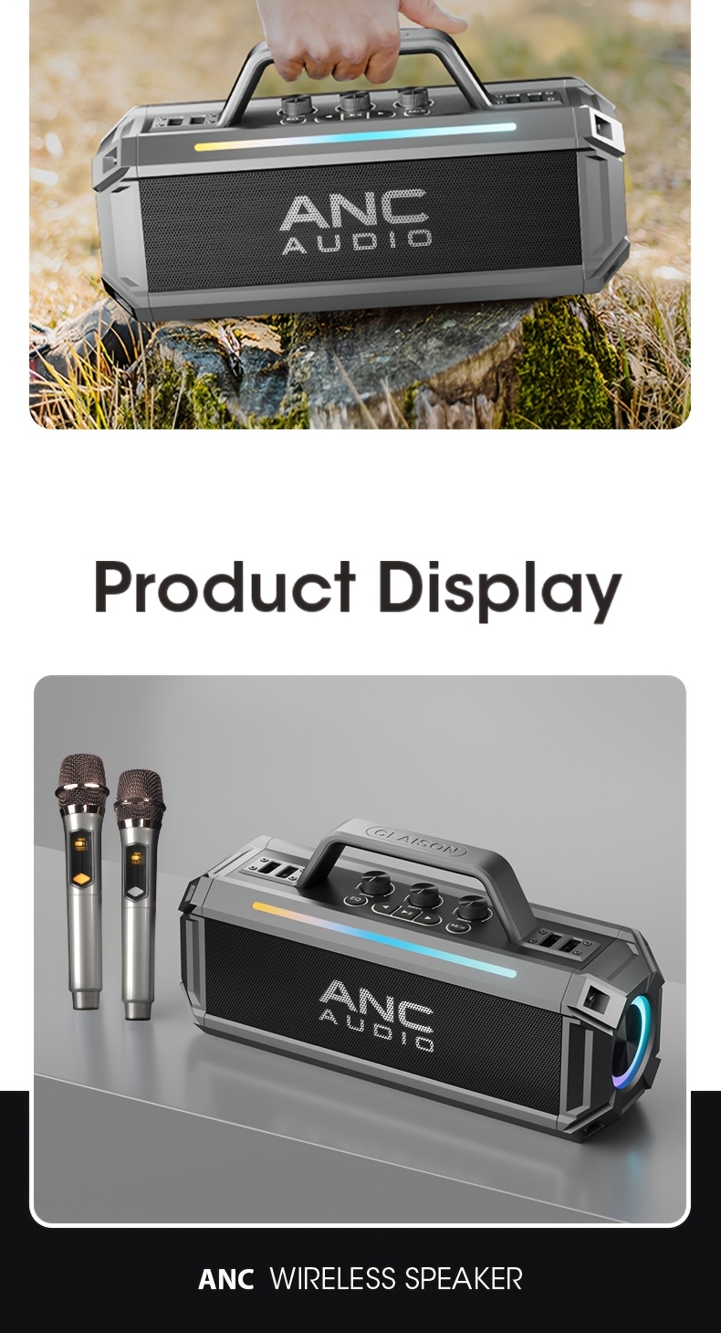 7-speaker Subwoofer, Dual Wireless Mic, 12 Hours RGB Atmosphere Light, Outdoor, FX EQ, U Disk, TF Card, AUX, Beautiful Voice, One-key Mute