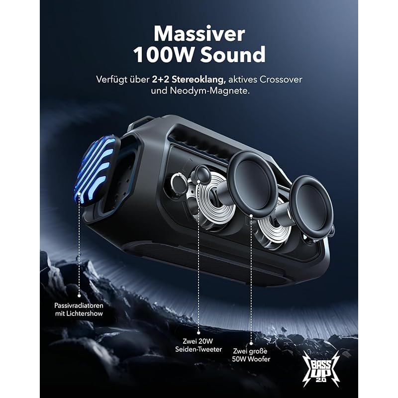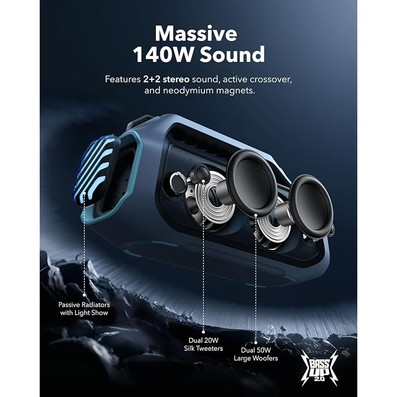 Soundcore Boom 2 Plus by Anker, 140W Outdoor Speaker, 2+2 Channel, BassUp 2.0, 20H Playtime, Fast Charge, IPX7 Waterproof, RGB Lights, Power Bank, Bluetooth 5.3, Portable for Outdoors [Refurbished].