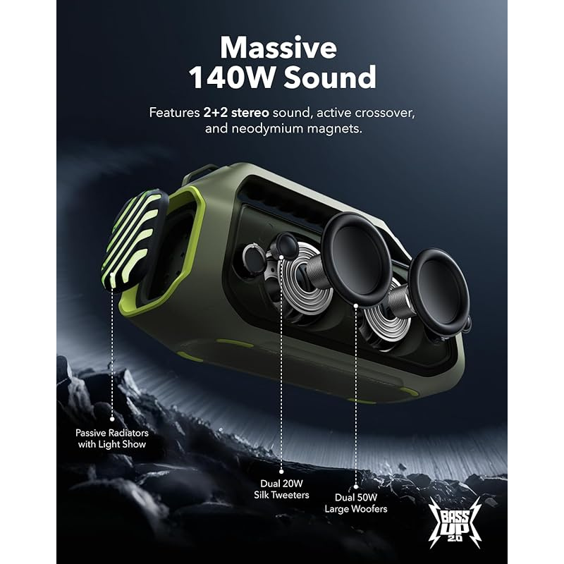 140W Outdoor Speaker, 2+2 Channel, BassUp 2.0, 20H Playtime, Fast Charge, IPX7 Waterproof, RGB Lights, Power Bank, Bluetooth 5.3, Portable for Outdoors, Camping Refurbished